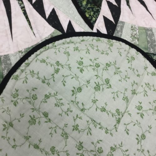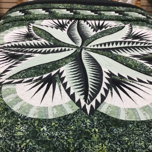The Fire Island Hosta Quilt is a complex but attractive quilt pattern. The quilt includes a scalloped border with a 19 inch drop per side and 326 yards of hand-quilting.