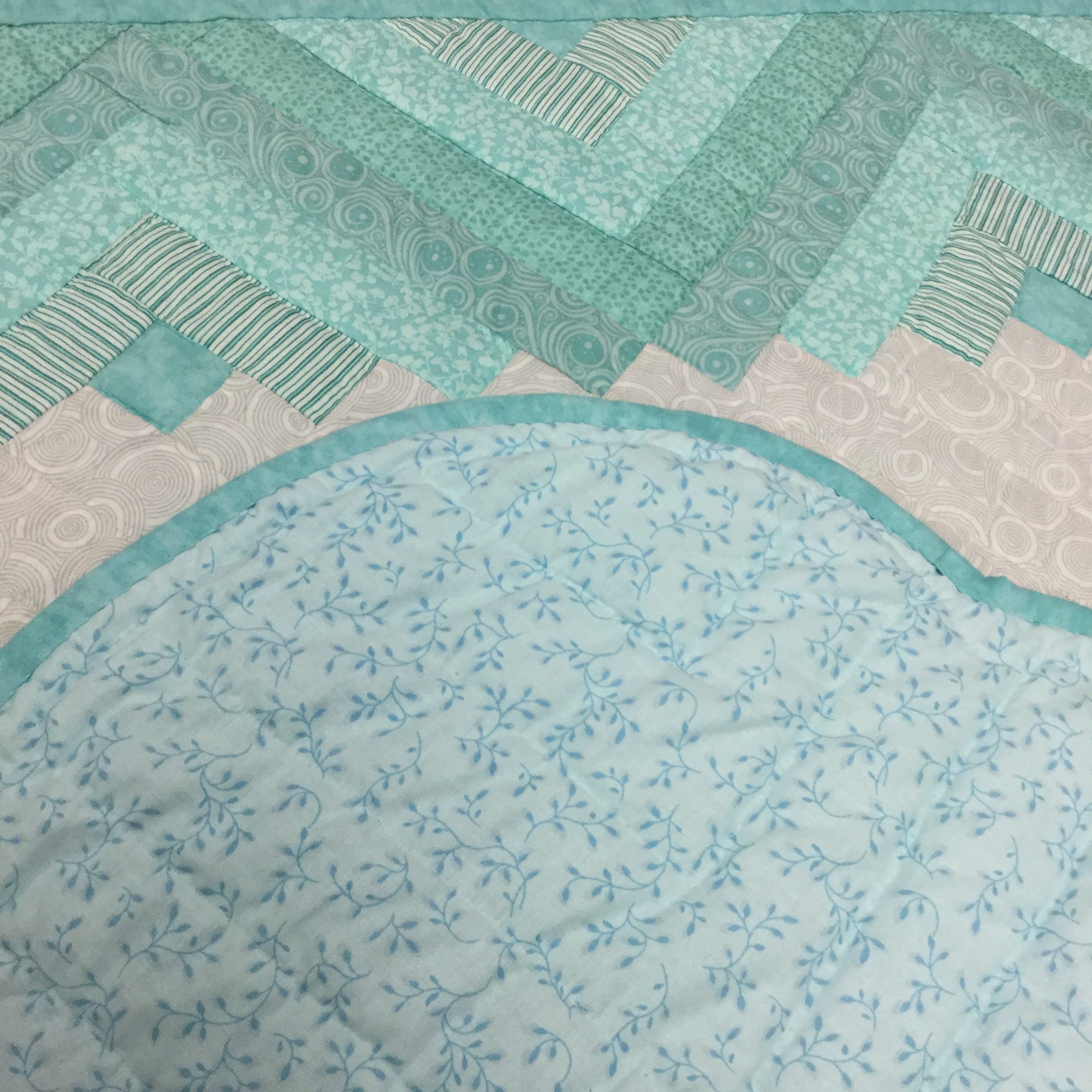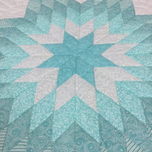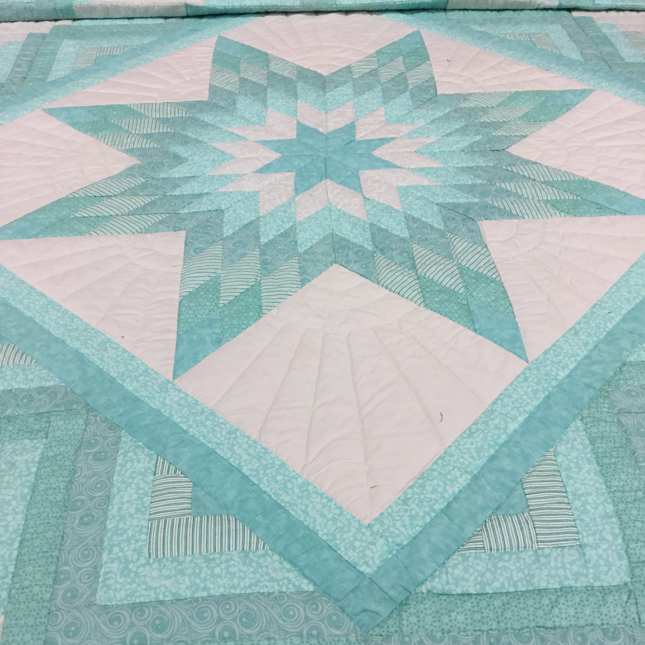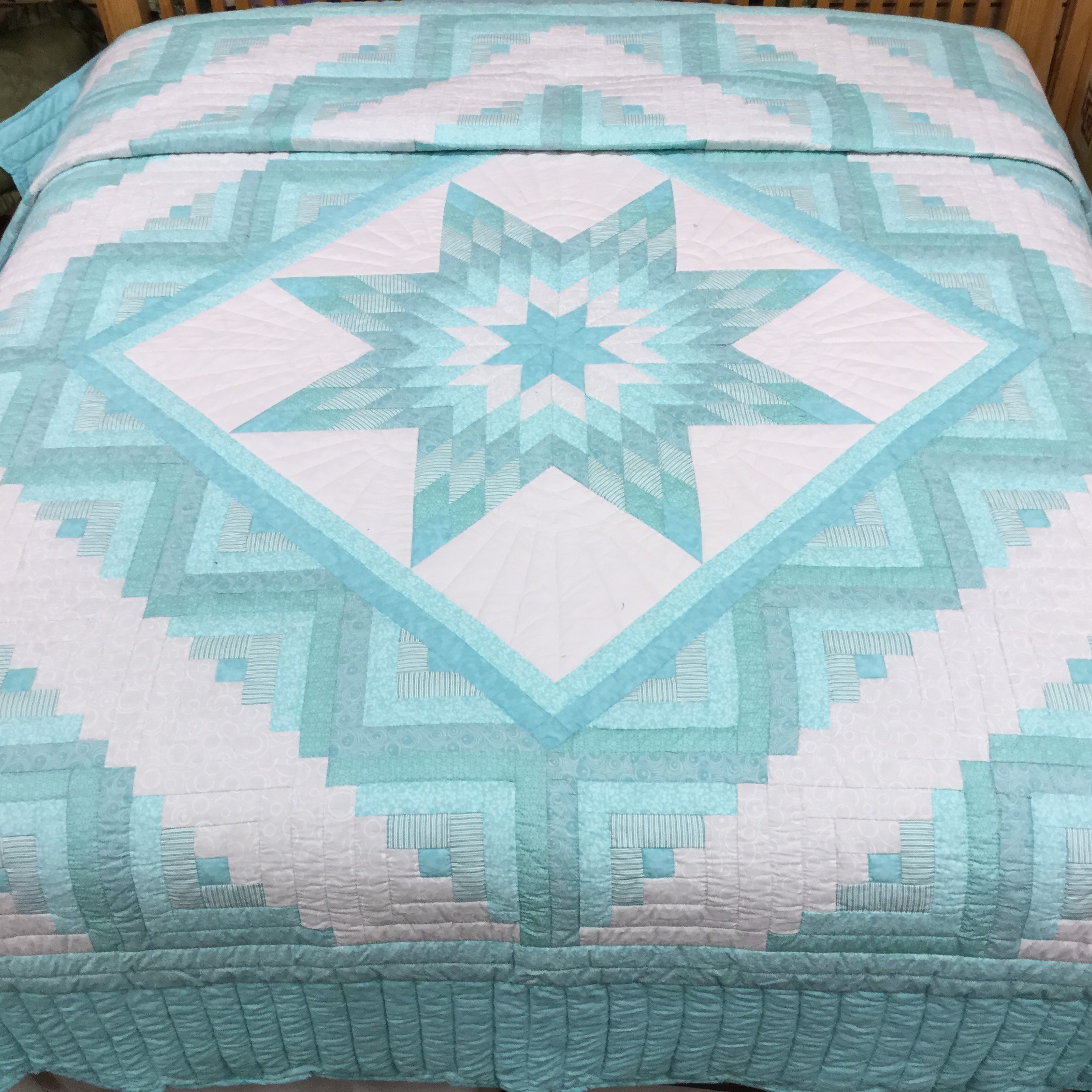 A handmade Amish quilt makes a comfortable bed spread and a family heirloom to be passed from generation to generation. Each quilt is handmade with love by one of our fine quilters. A large center star pops out between green and tan Log Cabin patches. The quilt is initialed and dated and quilted with 278 yards of thread by one woman to ensure consistent stitching. On a king bed, this quilt will have a 15-inch drop per side.