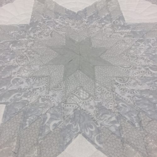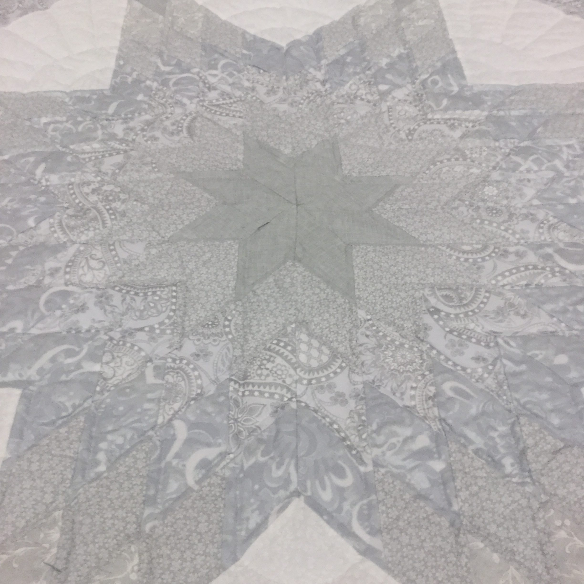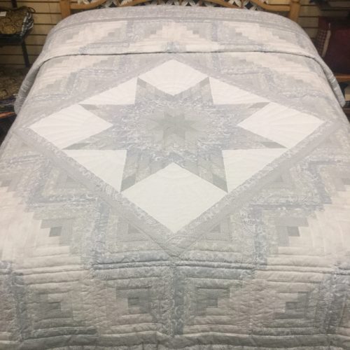 This Log Cabin Lone Star Quilt boasts a scalloped border and 385 yards of very neat hand-quilting, all quilted by one Pennsylvania Amish lady to insure even stitches.