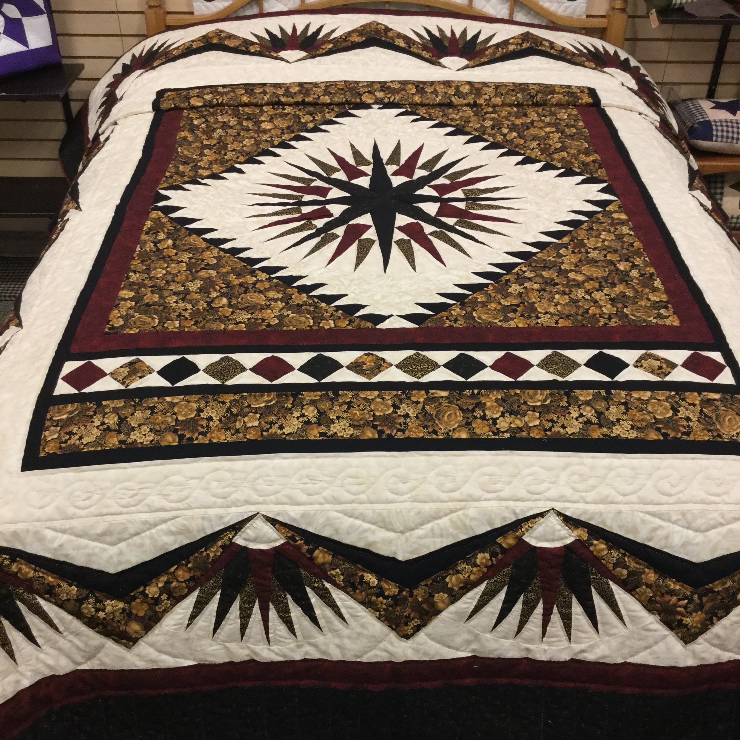 The Mariner’s Compass Quilt originates from one of the earliest quilt designs in America. The patchwork quilt pattern is composed of the thirty-two precise points of the compass, with the stars radiating from the center. Partial compasses surround the entire quilt and complement the pillow head. This Mariner’s Compass Quilt is hand-quilted by one Amish or Mennonite woman, ensuring even stitches.
